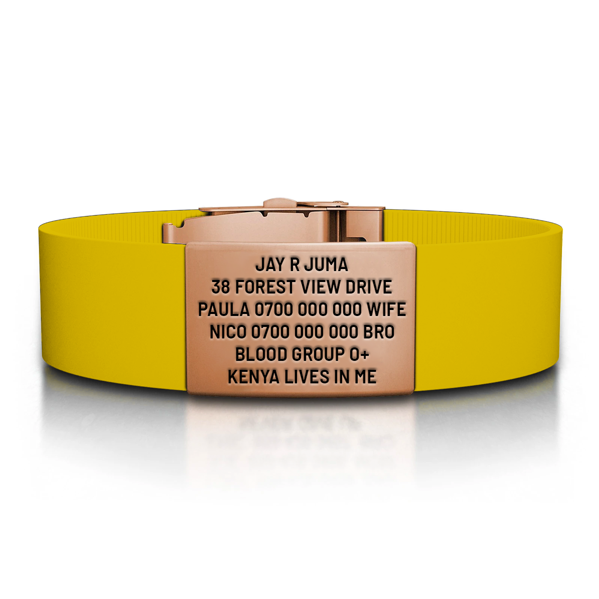 The beautiful rose gold ICETAG comes with black engraving on a surgical grade stainless steel faceplate. Comes with a tri-fold double lock clasp on a silicone wrist band.